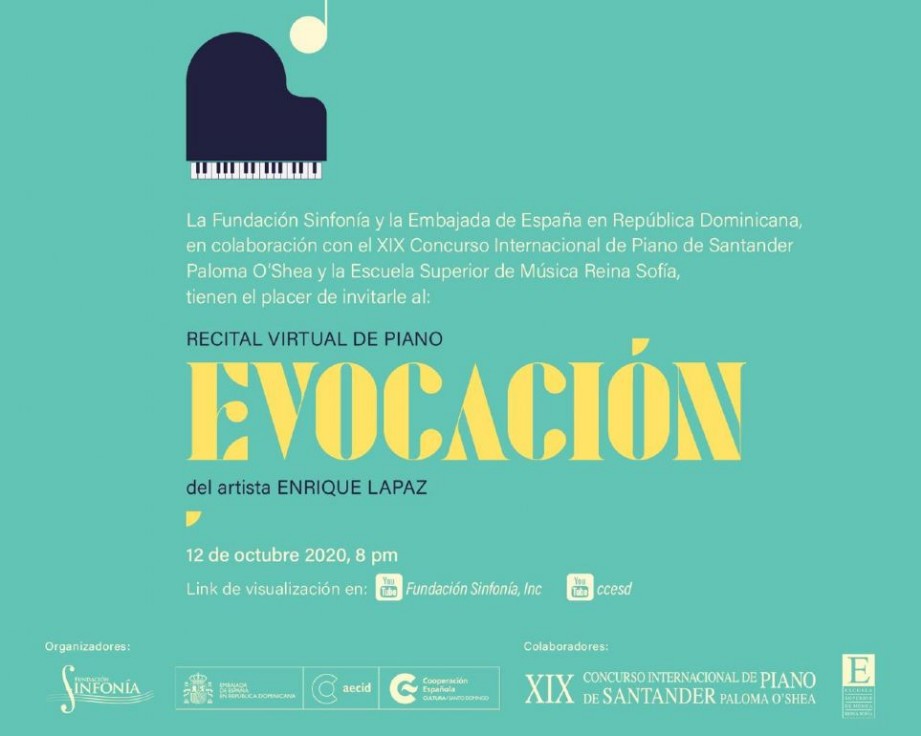 La Embajada de España en República Dominicana inaugurará la VIII edición de «Semanas de España» con un recital de piano de la mano de la Fundación Sinfonía y de la Escuela Superior de Música Reina Sofía, a cargo de Enrique Lapaz. La cita será retransmitida el próximo lunes 12 de octubre, Día de la Hispanidad, a las 20:00 horas, a través de las redes sociales de la Embajada de España, Fundación Sinfonía y del Centro Cultural de España. La cita, que se presenta bajo el rótulo de «Evocación», tendrá lugar en el Auditorio Sony de la Escuela Superior de Música Reina Sofía, del qe ha sido alumno Lapaz.