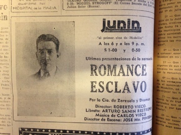 La edición XXIII del Festival Ópera al Parque, organizado por la Orquesta Filarmónica de Bogotá y que tendrá lugar del 20 al 22 de noviembre en Bogotá [Colombia], presentará Romance esclavo, la tercera zarzuela compuesta por Carlos Vieco (1900-1979). La obra fue estrenada el 12 de agosto de 1947 en el desaparecido Teatro Junín de Medellín (Colombia). En 1958 se presentó una segunda versión en el mismo teatro, con algunos nuevos números musicales. Del libreto original, del dramaturgo Arturo Sanín Restrepo (1900- 1972?) existe una versión fechada en 1953.