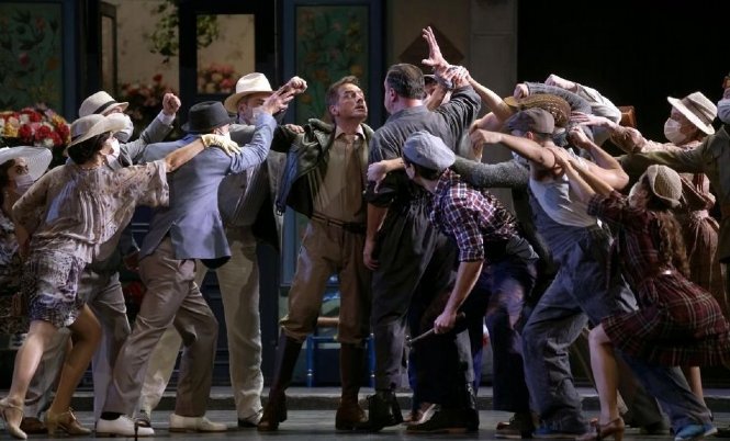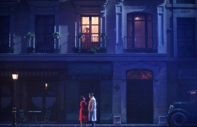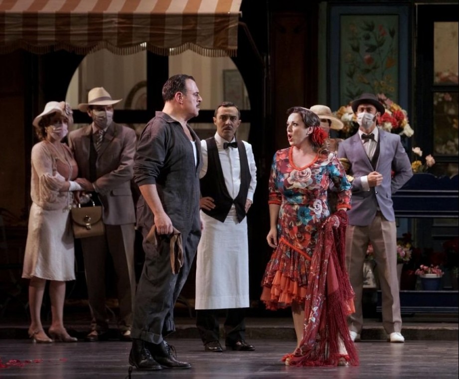 La producción de Emilio Sagi, que durante estas tres décadas se ha respuesto en diversas ocasiones en el propio Teatro de la Calle Jovellanos, además de viajar por diversas ciudades españolas y presentarse en capitales europeas de la categoría de París y Roma, nos presenta el barrio de Madrid conforme a las indicaciones del libreto, con una magnífica escenografía de Gerardo Trotti que reúne realismo grandioso, belleza, funcionalidad y ni un resquicio para que nadie hable de cartón piedra ni «caspa». La calle madrileña, que incluye una placa que homenajea a Teresa Berganza –nada más merecido, por supuesto-, el taller mecánico, el bar y la floristería son tales. Algo que se ha convertido en insólito en la mayoría de montajes de las últimas temporadas del Teatro de la Zarzuela, pródigo en deslocalizaciones sin justificar, «adaptación de Fulano», «versión de Mengano». Emilio Sagi sirve a la obra, potencia todas sus virtudes, no se sirve de ella para encauzar extrañas ocurrencias, ni forzadas dramaturgias «paralelas». Elegancia, buen gusto, dinamismo teatral basado en un movimiento escénico bien trabajado y personajes impecablemente caracterizados, se valen de una espléndida iluminación de Eduardo Bravo, del vestuario de Pepa Ojanguren y la coreografía de Goyo Montero, los dos últimos ya desaparecidos, por lo que Nuria Castejón se encargó de la reposición de la misma. Hay que agradecer que ni siquiera la pandemia haya impedido la reposición de esta joya de montaje, cuya reposición periódica debería ser obligatoria. La representación discurrió sin descanso con unos 100 minutos de duración y aunque hubo cortes en los diálogos, fueron escasos, manteniéndose los hilarantes e imprescindibles de Espasa, de manera que se aseguró la perfecta comprensión de la trama.