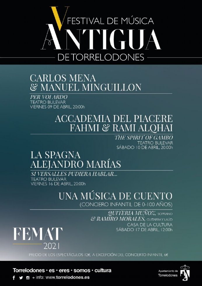 El Festival de Música Antigua de Torrolodones [FEMAT], una de las apuestas en el ámbito musical más importantes de la Concejalía de Cultura del Ayuntamiento de esta localidad madrileña, que cuenta además con la dirección artística del importante clavecinista español Ignacio Prego, acaba de presentar su quinta edición, que se celebrará entre los días 9 y 17 de abril. Este festival de joven trayectoria, pero el que han pasado ya figuras de la talla de Thomas Dunford, Amandine Beyer, Maurice Steger, Seckou Keita o La Ritirata, volverá a llevarse a cabo en la sala principal del Teatro Bulevar. La presente edición está marcada, como no podía ser de otra forma en un momento como el actual, por un apoyo a los artistas nacionales. Abrirán el festival el viernes día 9 el dúo conformado por el contratenor vitoriano Carlos Mena y la vihuela de Manuel Minguillón, con su programa Per voi ardo, fruto de una reciente grabación discográfica, centrado en repertorio madrigalístico y profano para voz y cuerda pulsada de los siglos XVI y XVII. Los hermanao Fahmi y Rami Alqhai serán los protagonistas en la noche del sábado 10, que ofrecerán un recorrido por la literatura para la viola da gamba bajo el título The Spirit of Gambo. El viernes día 16 será el turno de La Spagna y su director Alejandro Marías, que nos transportarán a la época central del barroco francés con su programa Si Versalles pudiera hablar, que ilustra la relación entre compositores de la corte en épocade Luis XIV y Luis XV. El cartel se completa el sábado 17 con un concierto infantil a cargo de la soprano Quitería Muñoz y el laudista y guitarrista Ramiro Morales, que dedicarán su actuación a los mas pequeños, con un concierto infantil llamado Una Música de Cuento, que pretende acercar a los asistentes los secretos de la música renacentista y barroca, y enseñarles cómo esta ha llegado a nuestros días.