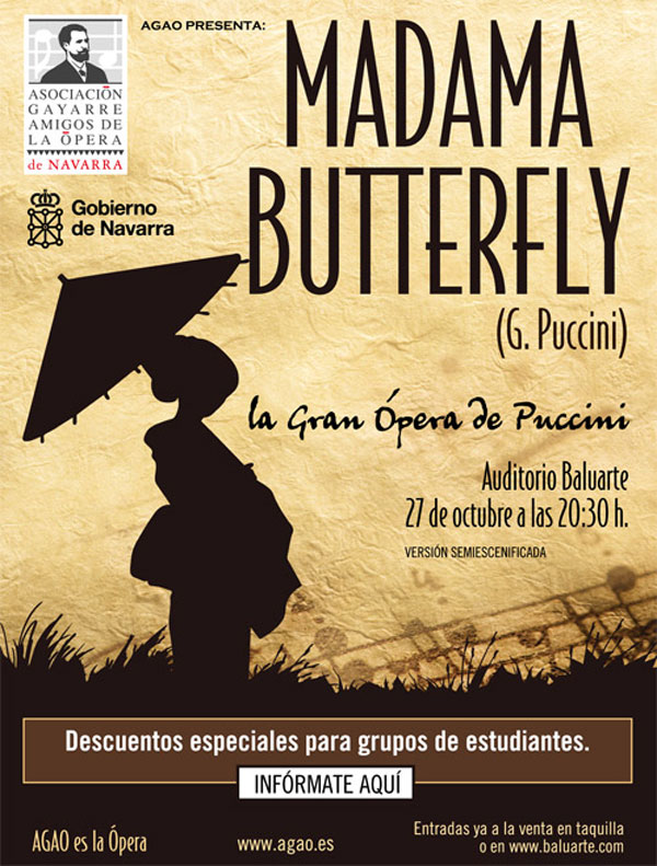La Asociación Gayarre de Amigos de la Ópera (AGAO), con sede en Pamplona, retoma sus actividades con una función semiescenificada de Madama Butterfly de Puccini, en el auditorio Baluarte de la capital navarra, el próximo sábado 27 de octubre, a las 20:30 horas. Se trata de una propuesta de interés, sobre todo por la presencia en el rol protagonista de Cio-Cio-San de la soprano milanesa Amarilli Nizza, aclamada precisamente por su encarnación de la geisha japonesa (el pasado año en Sevilla, sin ir más lejos). Junto a ella, voces jóvenes pero ya bien conocidas en el panorama español, como la del tenor vizcaíno Andeka Gorrotxategui como B. F. Pinkerton y el barítono Borja Quiza como Sharpless. Redondean el reparto las voces de Elena Cassian como Suzuki, Vicenç Esteve como Goro, Alfonso Echeverría como El Bonzo y Pablo Ruiz como Yamadori/Yakusidé, entre otros secundarios. José Miguel Pérez-Sierra será el responsable de la dirección musical, al frente de la Orquesta Clásica de España (OCE). El Coro "Premier Ensemble" de AGAO, dirigido por Iñigo Casalí, completa el cartel musical de esta función. La producción, una propuesta escenificada, corre a cargo de Lander Iglesias, e incluye a la orquesta en escena, además de decorados y vestuario.