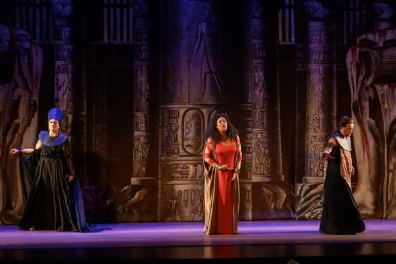 Para cerrar la temporada y bajo el amparo de la ya activa Fundación Ópera de Cataluña, la Asociación de Amigos de la Ópera de Sabadell la ha programado por tercera vez en sus casi 40 años de actividad. Y que, naturalmente, también visitó poblaciones como Manresa, Reus y el pasado día 9, Vic y su teatro de La Atlántida. Debido a la logística implícita en el montaje para los teatros del circuito Ópera de Cataluña y a los condicionantes de la pandemia, los directores de escena y escenógrafos Carles Ortiz y Jordi Galobart han reaprovechado y pulido la producción de 2012, enmarcando la obra en un escenario austero y muy unitario en los cuatro actos, buena iluminación de Nani Valls y jugando con una estética que combina el rojo, el negro y el blanco tanto en el vestuario como en los decorados. Éstos presentan unas escalinatas (dispuestas frontalmente y lateralmente) y unos telones transparentes de arquitecturas y esculturas egipcias dibujadas como marco escénico principal.