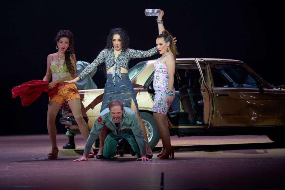 La citada propuesta escénica de Bieito, que ya fue ampliamente comentada en CODALARIO por Raúl Chamorro a propósito de las representaciones en el Teatro Real en 2017, sustituye la simbología en torno al mito femenino de la protagonista, que por otra parte deja intacto, por otra no menos potente, actualizada y más ibérica centrada en la Legión, la bandera y el toro de Osborne. Todo ello dejando no poco espacio a la recreación del espectador, sugiriendo más que mostrando, especialmente conforme avanza la obra hasta desembocar en ese extremadamente sobrio y desnudo cuadro final donde, con una cuidada dirección actoral, resalta más que nunca el dramatismo y violencia del tremendo desenlace.
