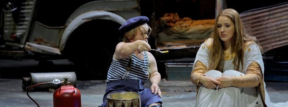 Apenas transcurridos un par de minutos de obertura, una de las emblemáticas de Wagner y que uno no puede disfrutar con la apropiada concentración, a telón bajado, sino que nos distraen de la música con imágenes de una narración videográfica que nos instala en una suerte de road movie de comedia negra. El Venusberg es una furgoneta con una troupe formada por unos seres marginales o salidos del mundo de las variedades del Teatro chino de Manolita Chen. Venus en plan vedette, una drag Queen de raza negra(Le gateau Chocolat), un enano (todos están muy bien en su cometido y no se pone en duda su profesionalidad), además de Tannhäuser vestido de payaso. Los cuatro se dedican a tomar drogas, robar una hamburguesería y hasta atropellar un agente de policía. Ver a Tannhäuser de tal guisa me saca inmediatamente de la obra tanto, como si presenciara un Trovador con Manrico ataviado de un mono de fontanero o una Tosca con la protagonista vestida de esquimal. El supuesto Tannhäuser empieza a cansarse de esta vida, por lo que abandona este particular Venusberg y después de una imagen del valle del Wartburg, aterriza en la colina verde de Bayreuth en la que el coro de peregrinos lo forman los asistentes anuales al Festival. El segundo acto es un ejercicio impecablemente resuelto técnicamente, todo hay que decirlo, de metateatro. En la mitad del escenario hacia abajo vemos una representación en Bayreuth de Tannhäuser considerada clásica (vamos, que debe ser de hace mucho) y en la mitad superior lo que ocurre fuera de escena, entre bambalinas. En mitad del concurso de Minnesänger irrumpe la troupe en el teatro, avanzan por sus dependencias e invaden la escena. Imaginen las situaciones risibles, grotescas, en plan sainete que se producen con personación al final de la policía (llega la forza como en el final del acto primero de la ópera buffa por excelencia, El barbero de Sevilla de Rossini) y colocación de la bandera arco iris sobre el arpa.