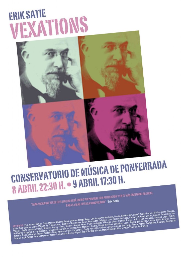 Los próximos días 8 y 9 de abril,  el Conservatorio “Cristóbal Halffter” de Ponferrada llevará a efecto una performance que, bajo el título de Proyecto Vexations y la coordinación de Luis Aracama y Jesús de Frutos permitirá asistir a la interpretación de las Vexations del compositor francés Eric Satie. El concierto, en el que participarán más de una treintena de pianistas, entre profesionales y estudiantes,  dará comienzo el día 8 de abril a las 22:30 h y tiene prevista su finalización unas 19 horas después. En el transcurso de la interpretación se proyectará un video realizado por el propio Luis Aracama.