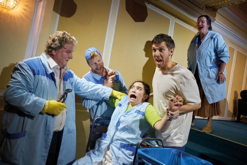 El director de escena Jan Eßinger utiliza la práctica totalidad del coqueto teatro de la calle Fleischmarkt. Sitúa a algunos figurantes de espaldas al público -al fondo del escenario- sentados frente a una cortina, mientras que la acción va progresando por todo el patio de butacas, a veces a escasos centímetros de la tuya -tremenda la escena de la extracción del diente solo un par de filas por delante-. La dirección de actores fue muy natural, permitiendo que cada cosa ocurra en su momento, sin necesidad de dramaturgias paralelas. Franz Tscheck diseña una iluminación acertada que por un lado permite separar las escenas y desarrollar la acción, y por otro deja espacio libre para que los cantantes se puedan cambiar de ropa para la siguiente escena. Siempre orden dentro del caos de la obra.