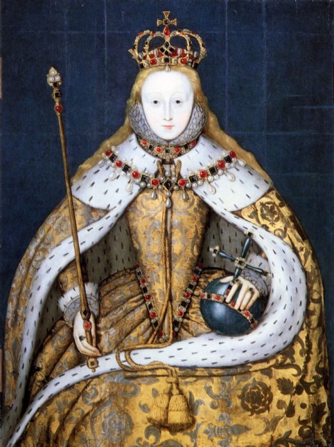 § Retrato de Elizabeth I durante su coronación [anónimo; copia de entre 1600-1610 del original de 1559; National Portrait Gallery, London].