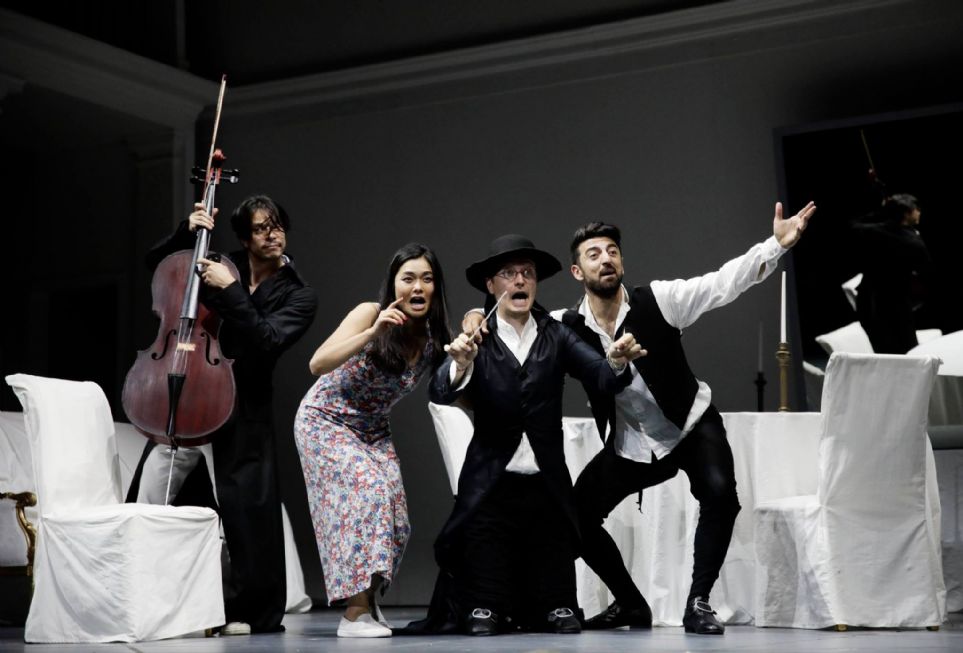 Efectivamente, el reparto vocal destacó más por su implicación interpretativa, por su buena labor de conjunto (a resaltar algo tan importante como la impecable articulación de los recitativos –completos por supuesto-), que por unas destacadas calidades vocales y canoras. Decía un amigo melómano, que en el Barbero originalmente concebido por Rossini no había ni una sola voz aguda. Sin embargo, la tradición ha atribuido el papel del Conde de Almaviva a tenores ligeros. En esa línea, Maxim Mironov, de timbre blancuzco y filiforme, de muy justa presencia vocal, cantó con finura y musicalidad la parte del Conde d’Almaviva, además de interpretar adecuadamente, con nobleza y empaque, al Grande de España, sacando adelante la endiablada agilidad del gran rondò final “Cessa di più resistere”. No se puede discutir la elegancia y aplicadísima musicalidad de Aya Wakizono, tampoco su buena agilidad y muy correcto canto, pero al fraseo le faltó variedad, resultando plano y más bien aburrido. Asimismo, Wakizono se anuncia como mezzo, pero es más bien un sopranino sin graves y un registro agudo discreto. Una Rosina, personaje espontáneo y desenfadado, que se presenta con una declaración de tintes feministas como “Una voce poco fa”, al que le faltó, bien es verdad, desparpajo, picardía y descaro. A pesar de que la ópera en su creación giraba fundamentalmente sobre el gran divo sevillano, el tenor Manuel García, el personaje de Figaro se hizo con el protagonismo desde el primer momento. Su verbo fantasioso y comunicativo, su jactancia, desenvoltura y capacidad para mover todos los hilos de la trama fueron bien traducidos por el barítono italiano Davide Luciano, de material vocal no especialmente rico ni voluminoso, pero sí bien emitido, homogéneo y dúctil. Pietro Spagnoli, que fue Figaro en Madrid en 2005 en el estreno de la producción de Emilio Sagi con Juan Diego Flórez como protagonista, canta ahora el Bartolo, viejo y gruñón tutor que quiere casarse con su joven pupila y quedarse con su dinero. Nunca he sido muy partidario de Spagnoli como cantante, pero valoro que compuso un Bartolo sin exageración alguna, huyendo de las muecas, de las exageraciones, en defitinitiva, de la búsqueda de la risa fácil e imbricándose perfectamente en la dinámica teatral del montaje, además de sortear con dignidad un aria tan complicada como “A un dottor della mia sorte”. Michele Pertusi nunca demostró un gran sentido del humor, pero después de tantos años de carrera sí puede presumir de gran oficio, tablas y dominio de la escena, que puso al servicio de un Don Basilio, que en esta ocasión tartamudea, ladino, convicente en su taimada astucia y su avidez por los cuartos y que, a pesar de un lógico desgaste vocal desgranó con solvencia la magistral “La calunnia”.
